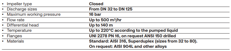 RD pumps have a simple, modular design according to ISO 2858–5199, using closed impellers for high efficiency and low NPSH. With discharge sizes from DN 32 to DN 125 and a heavy-duty shaft and bearings, they are built for reliable performance. These pumps handle aggressive liquids and are widely used in chemical and petrochemical industries, desalination plants, power stations, steel industries, environmental systems, and hot water distribution.